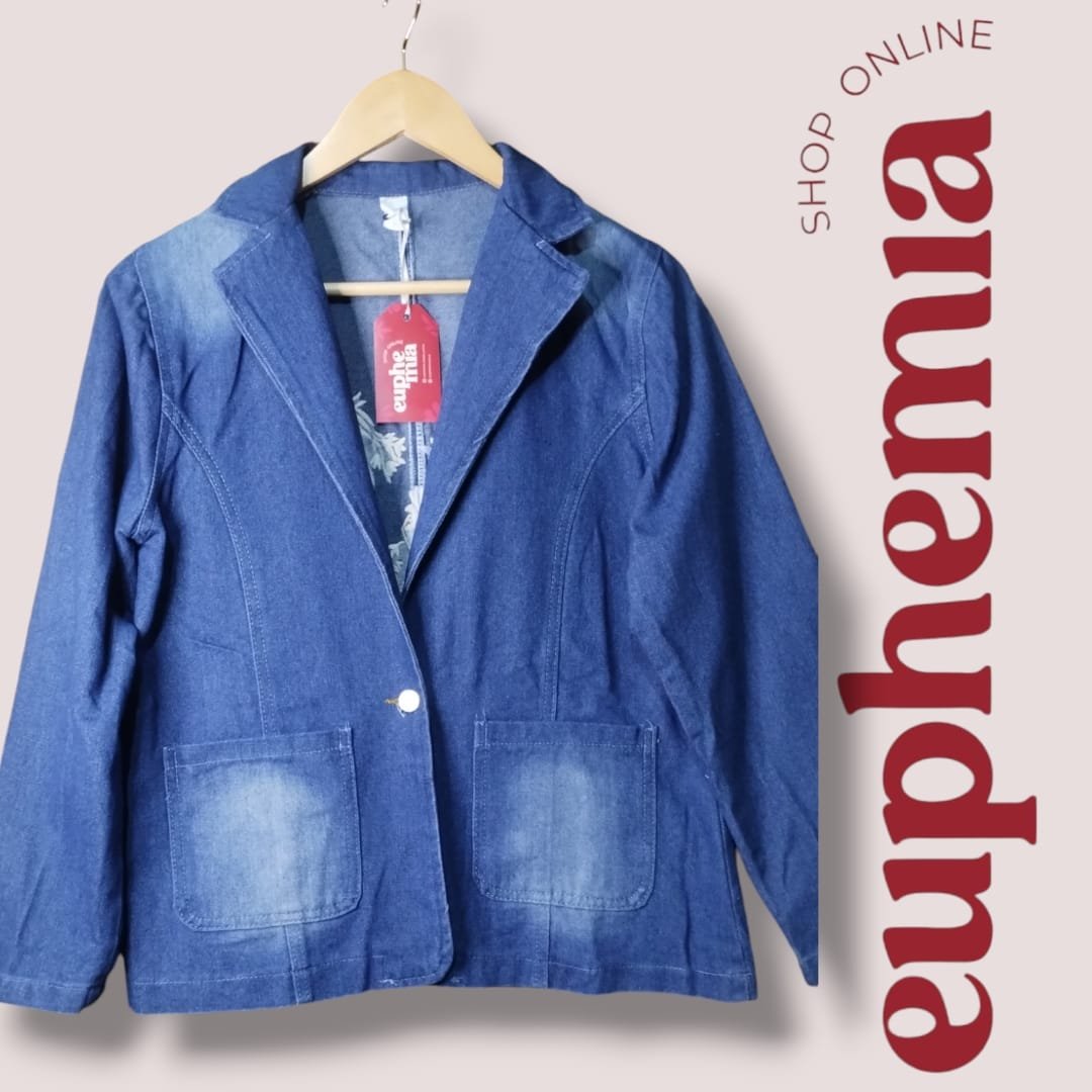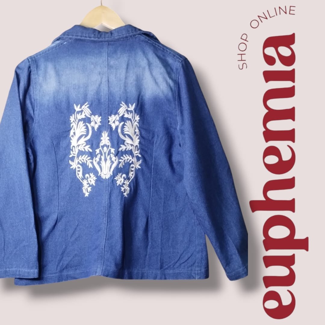 Descripción: campera de jean corte blazer con bordado en la zona de la espalda