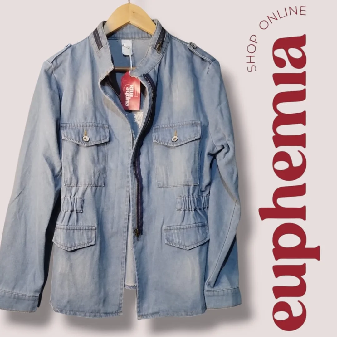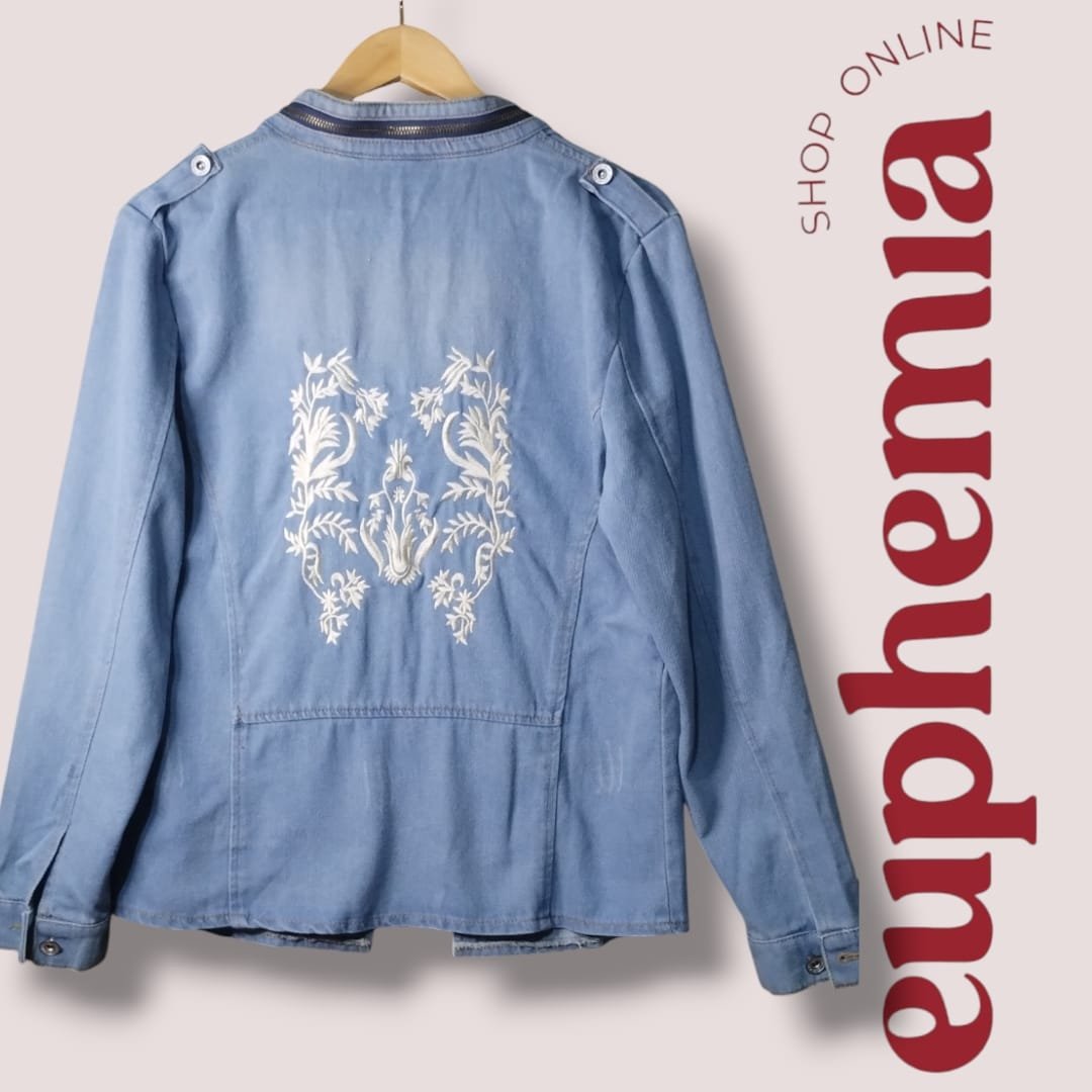 Descripción: campera de jean con detalle de recorte en cintura, cierre y cuello mao. bordado en la zona de la espalda